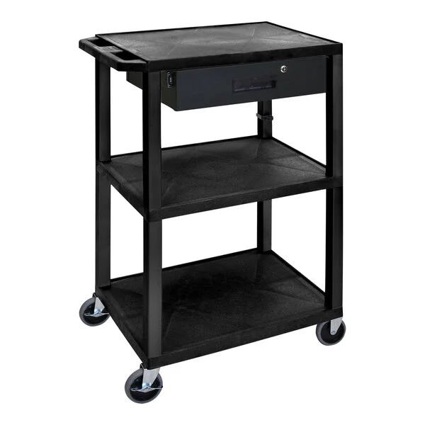Luxor UCPL1E-B-WTD Plastic 3-Shelf Powered Utility Cart with Heavy-Duty Casters, Locking Drawer
