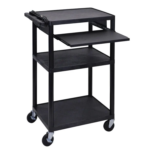 HDPE structural foam molded plastic resists scratches, dents, stains, and rust300 lb. total weight capacity evenly distributed between shelves(3) 24" x 18" flat shelves with 1/4" retaining lipsPush handle and (4) 4" non-marring, swivel heavy-duty casters with 2 locking brakesKeyboard shelf with 3-outlet electrical assembly, 15' cord, and cord storage