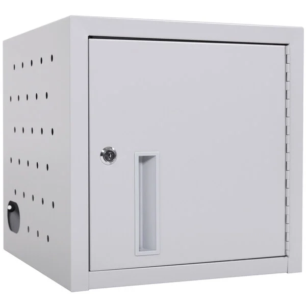 Holds up to 8 tablets or laptops safely in placeRubber-coated dividers spaced 1" to keep equipment organizedVented side walls to prevent equipment overheatingIncludes 16-outlet electrical assembly; input electrical range of 110-240VMaximum weight capacity of 40 lb.Lockable cabinet for added securityMounting hardware for drywall surfaces includedSpace-saving vertical designLockable